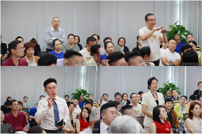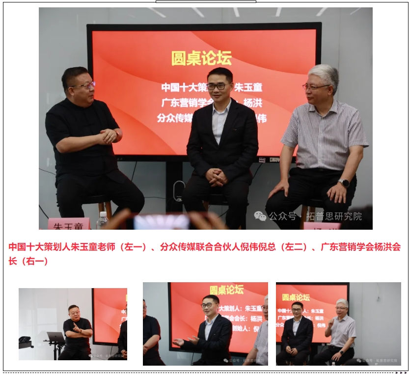 在轻松愉快的氛围中,中国十大策划人、金老虎商学院特邀专家朱玉童老师,广东营销学会杨洪会长,以及刚刚结束精彩分享的倪伟倪总围坐台上,进行了一场关于"企业人员管理、企业进化发展、用户触及"等议题的深度对话。三位嘉宾的交流为现场的企业家们提供了宝贵的启示和借鉴,不仅加深了大家对企业管理、市场营销等方面的理解,更为未来的商业实践提供了有益的指导方向。