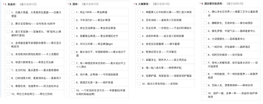 食品酒类:青岛啤酒、燕京啤酒、五粮液、衡水老白干、长城干红、乌江、君乐宝奶粉、白象集团、黄老五、麦轩食品、卡士牛奶等。
