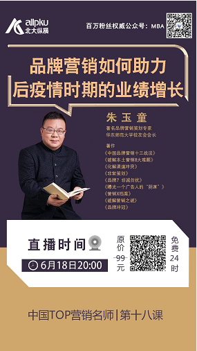 2020年6月18日晚8点,北大纵横·中国TOP营销名师/第18课正式开讲,中国十大策划人,深圳市采纳品牌营销顾问公司总经理朱玉童先生受邀,作为本期线上直播课的主讲嘉宾。