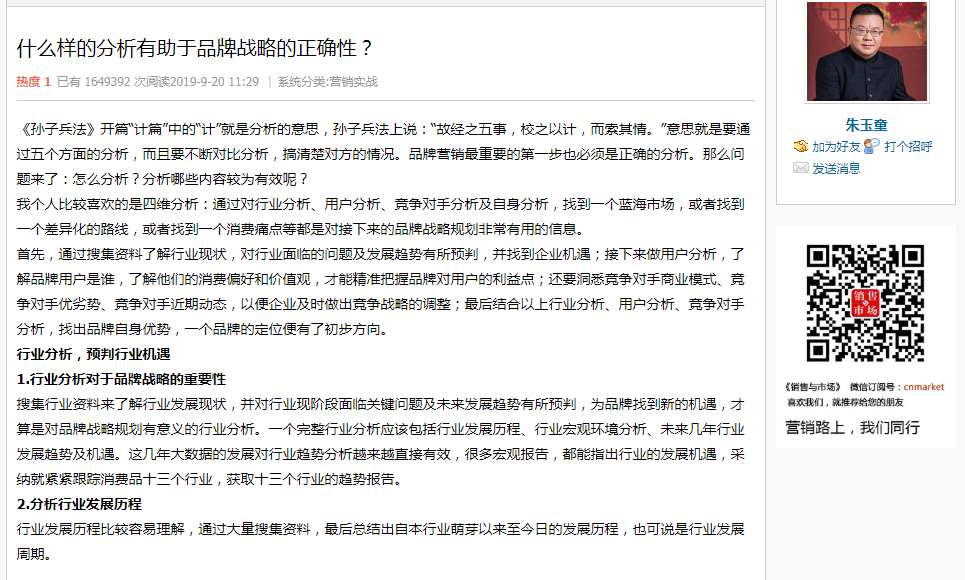 近日,朱玉童先生系列文章之《孙子兵法·计》篇在销售与市场专栏受到读者的热烈追捧,销售与市场方表示,此篇文章也收到读者的广泛转发!