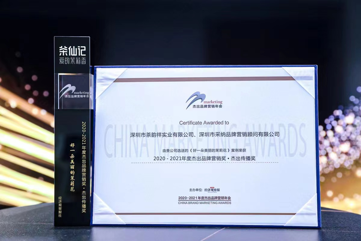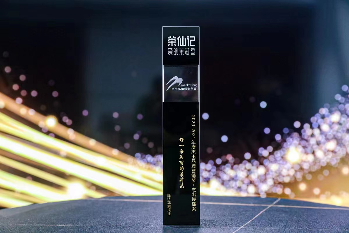 在今年的营销年会中,茶仙记品牌凭借 “好一朵美丽的茉莉花” 项目案例,在经过了各项严苛评审后,最终在266份参审案例中脱颖而出,一举夺得了2021年度杰出品牌营销奖-杰出传播奖殊荣。