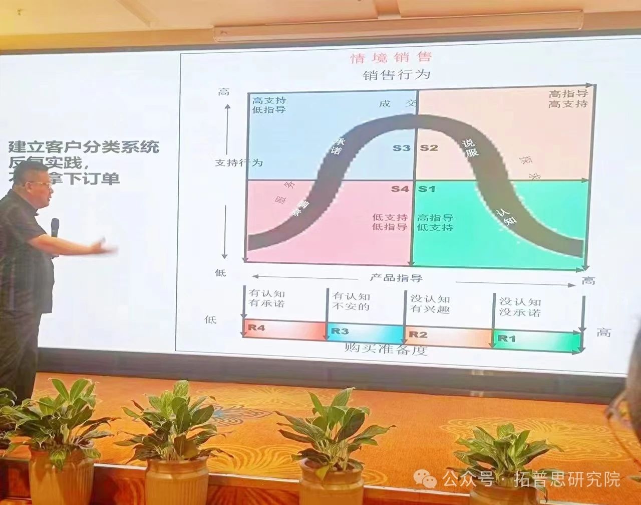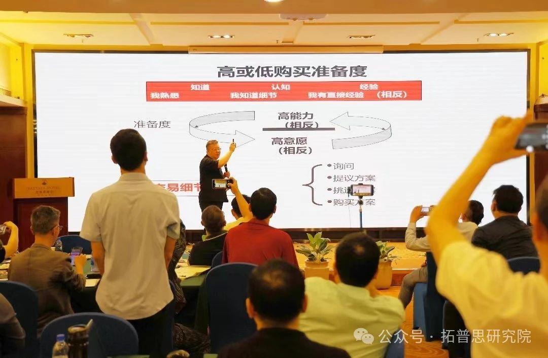 接着,朱老师带来《如何成交——情景销售法上、下》分享,以达尔文的《物种起源》为引,指出营销进化思维的重要性,介绍FABE法则的运用,揭示了营销领域的两种思维范式:X范式与Y范式,并说明以客户为中心的Y范式思维才是营销的核心。此外,朱老师为企业家们揭秘了业务销售的进化之路,将业务定位分为业务员、销售工程师、销售服务师、客户顾问、企业导师五大角色,鼓励企业家们完成角色的进化和转型升级,做咨询型销售而非业务型销售。他还详细阐述了保罗赫塞的情景销售模式、高水平咨询顾问拜访客户的7大技巧,要根据销售情景的不同,对客户购买准备度的四个状态进行判断,实时调整销售风格,以实现快速成交。