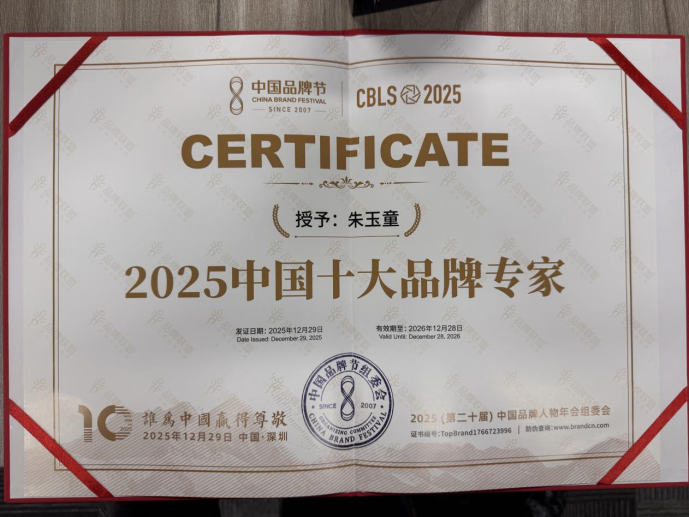 此次荣获“TopBrand 2025中国十大品牌专家”,不仅是对朱玉童老师个人专业贡献的高度认可,也是对采纳公司多年来坚持”以客户为中心”的服务理念、以专业智慧赋能中国品牌成长的充分肯定。