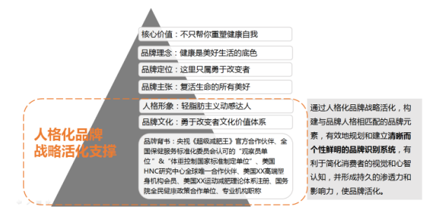 经过分析,最终得出,减肥达人的品牌形象为:勇于改变的专业快乐英雄。这一形象是一个敢于追逐梦想,敢于实现梦想的人,因此减肥达人的品牌定位为:只属勇敢改变者。再确立其品牌主张为:复活生命的所有美好。从用户思维角度出发,挖掘品牌核心价值,明晰用户的显性需求和隐性需求,挖掘用户痛点、痒点和兴奋点,得出减肥达人的核心价值和品牌理念,最终总结出减肥达人的品牌金字塔。