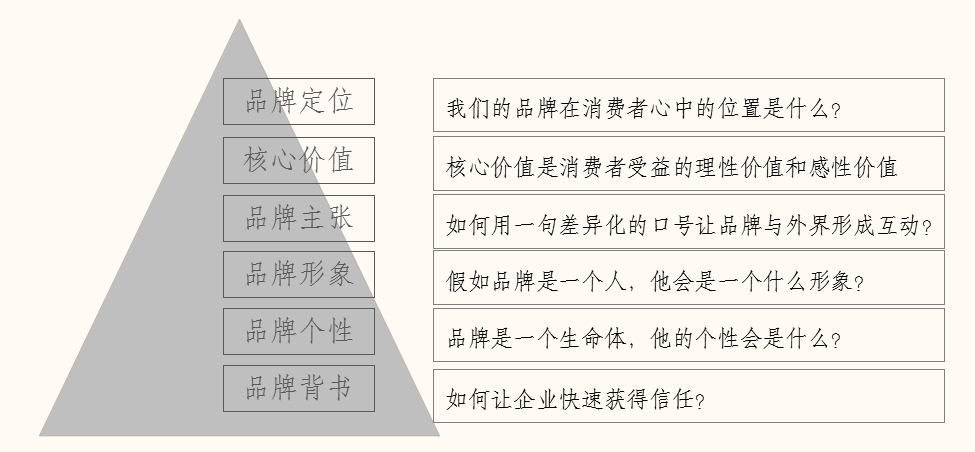 我们应该先弄清一个完整的“品牌金字塔”应该包含哪些元素,它们自上而下分别为: