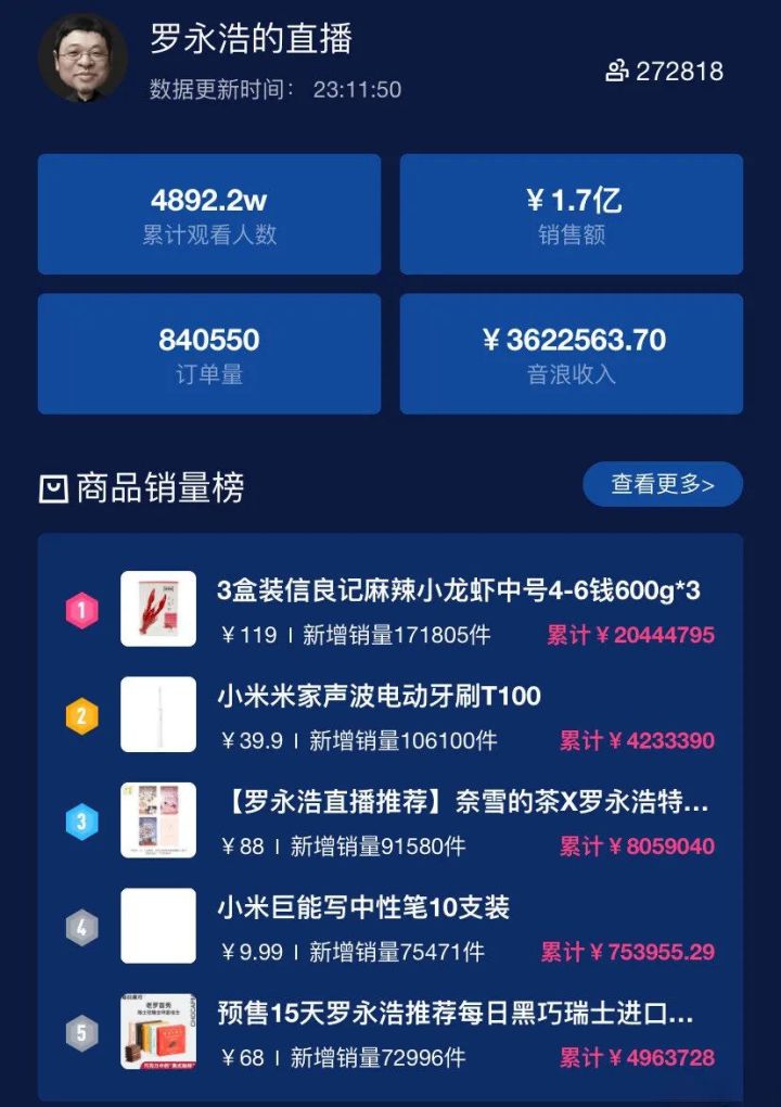 4月1日,曾经的“公孙永浩”以一个特殊的身份开启了“卖艺”生涯。在波澜不惊的3个小时直播过程中,虽时刻濒临“翻车”的处境,但结果喜人。累计推荐23件产品,累计观看人数是4880万,实现销售额1.1亿。放眼直播带货界当红流量李佳琦与薇娅,这也是个不错的战绩。