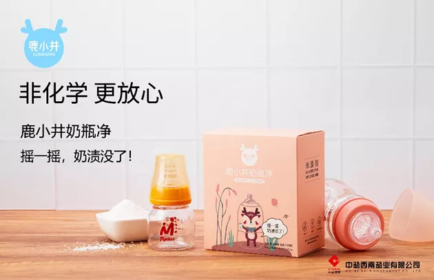 结合目标消费群体需求和非化学原理,塑造专业化产品体系,打造非化学全场景战略产品矩阵。根据不同洗护场景,对相应竞品信息进行扫描,设计一组直接彰显产品功能利益及消费诉求的系列名,鹿小井餐具净、鹿小井果蔬净鹿小井奶瓶净、”三大产品系列。并为鹿小井的三大产品线提出非化学“几大核心卖点,直接运用到产品包装上。
