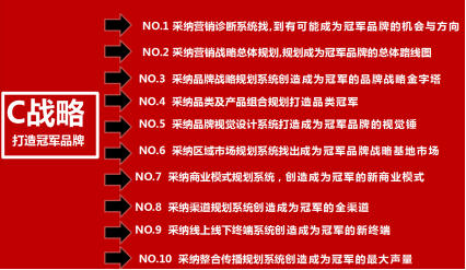 采纳C战略永远站在消费者的立场来洞察商业,通过市调、品牌营销战略、品牌与产品规划、视觉系统打造、区域市场与长夜模式、渠道规划、终端以及传播这十大体系,系统打造冠军品牌。