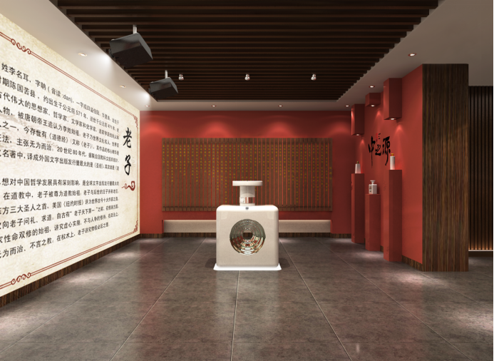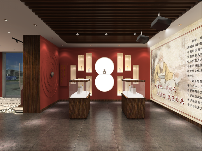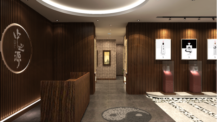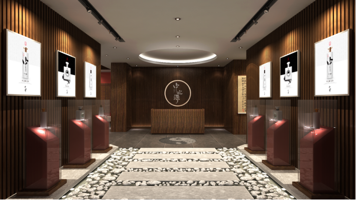 设计风格:以酒文化中心,围绕老子道德经,我们锁定“源”字为设计出发点,在空间中巧妙运用水元素,打造一个有灵气的白酒文化馆。